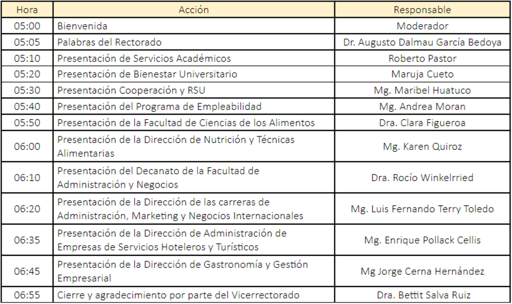 Aquí obtendrás información importante sobre las siguientes áreas: Servicios Académicos, Bienestar Universitario, Cooperación y RSU, Programa de Empleabilidad. Además conocerás a los líderes académicos de cada carrera e información importante sobre cada una de ellas.