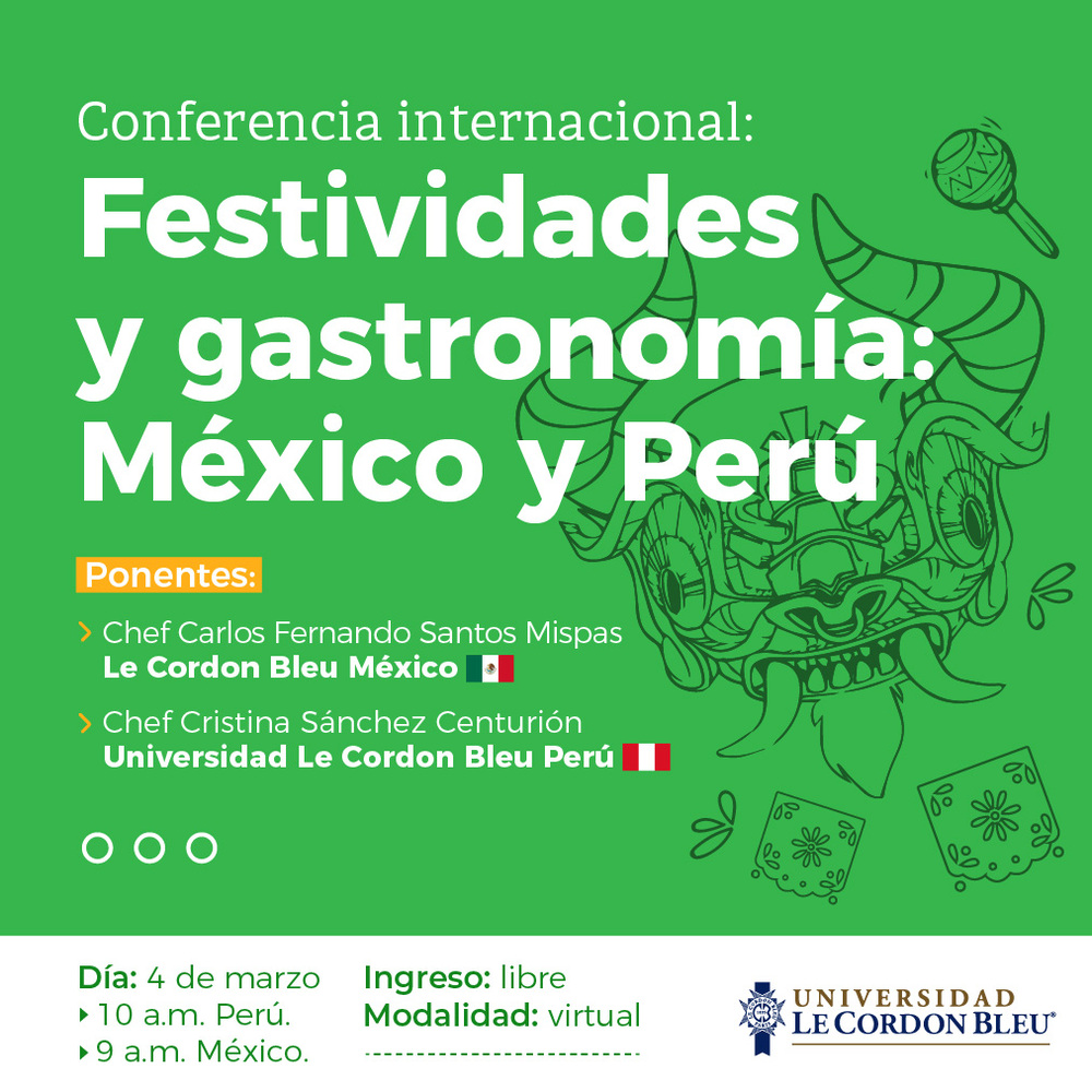 Con el objetivo de revalorizar las costumbres y su rol en la gastronomía, te presentamos la conferencia internacional: “Festividades y Gastronomía: México y Perú”, espacio donde se abordará la relación entre las festividades y la gastronomía de ambos países.