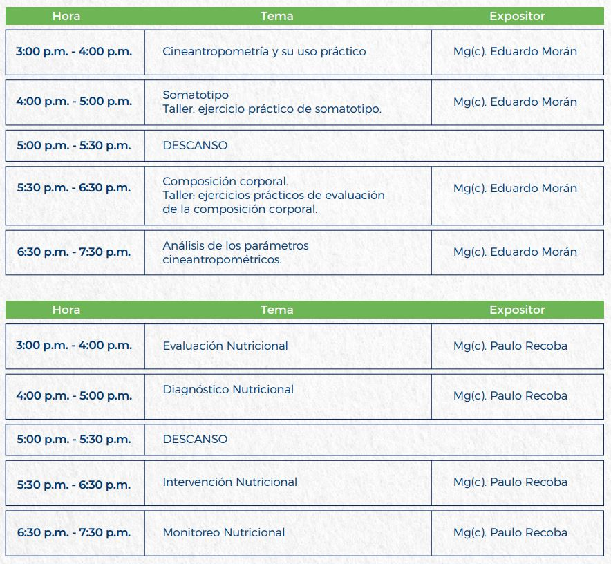 En este espacio académico y de investigación se tendrán los siguientes 2 ejes centrales: La Evaluación y Análisis del Perfil Cineantropométrico y Los Fundamentos del Proceso de Atención Nutricional.
