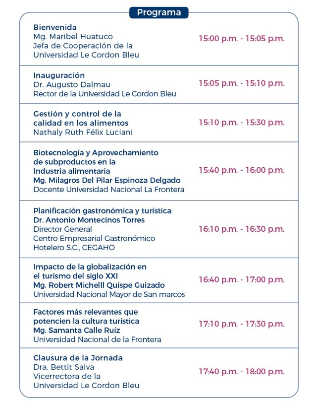 La globalización exige una capacitación y actualización constante en diferentes aspectos, sobre todo el académico. Por ello, la Universidad Le Cordon Bleu promueve la II Jornada Nacional “Avances y Perspectivas en un mundo globalizado”, evento que busca propiciar el encuentro entre académicos y estudiantes de diferentes universidades nacionales para el desarrollo de temas enfocados en turismo, gastronomía e ingeniería.