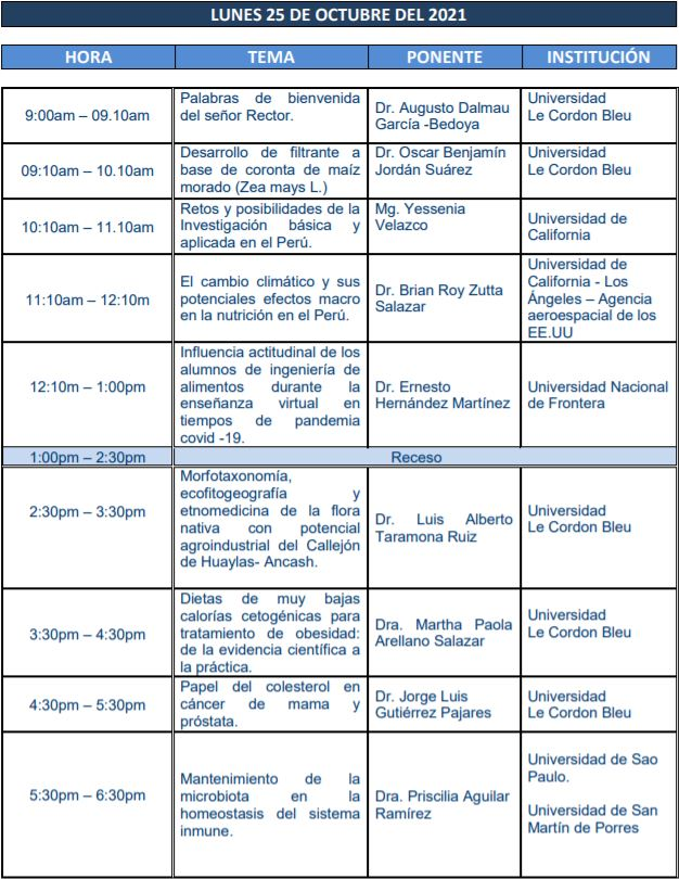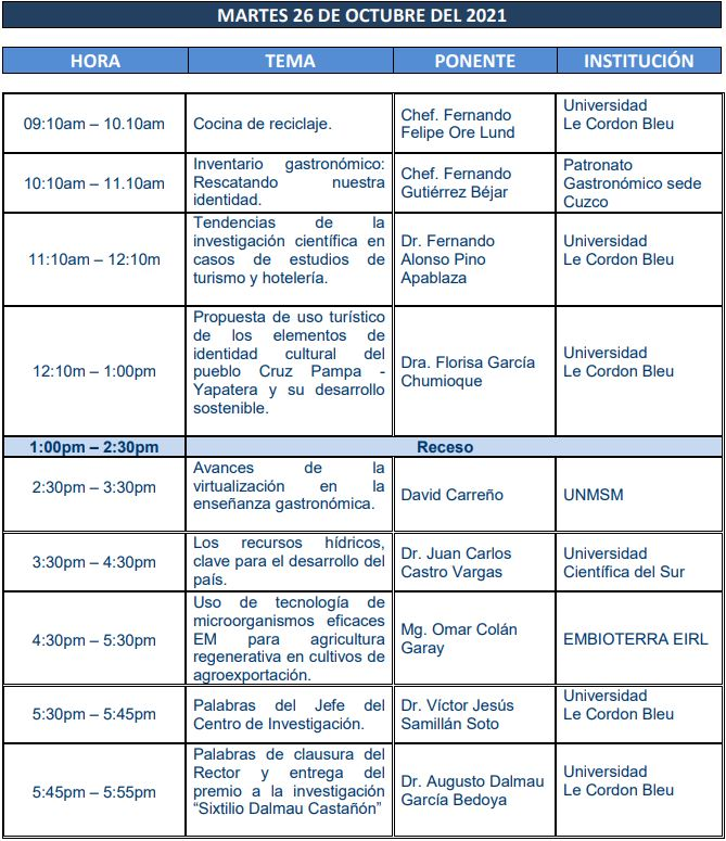 En la Universidad Le Cordon Bleu estamos convencidos de la importancia de la ciencia y la investigación para el desarrollo de nuestra sociedad, por ello, presentamos la tradicional y reconocida Jornada Ciencia, Tecnología e Innovación “Sixtilio Dalmau Castañón” en su edición 2021. Esta actividad académica busca propiciar el debate científico entre investigadores de diferentes instituciones, además de generar networking entre investigadores y estudiantes.