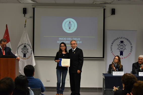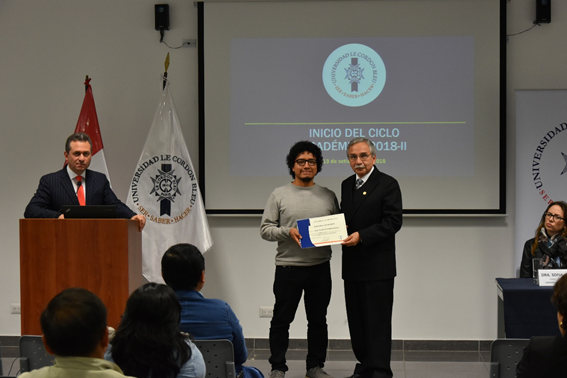 Además, el rector de la universidad, Dr. Esteban Horna, entregó los diplomas de reconocimiento a los alumnos que el ciclo pasado obtuvieron las más altas calificaciones: