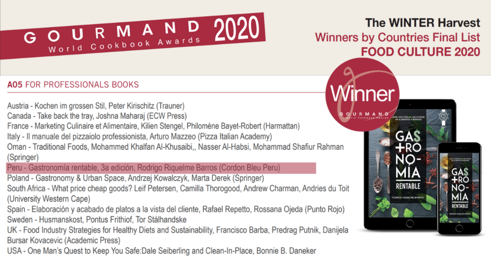 Gastronomía Rentable es el título del libro ganador del Gourmand World Cookbook Awards 2020 en las categorías “Mejor Libro Profesional de Gastronomía” y “Mejor Libro Educativo de Gastronomía”.