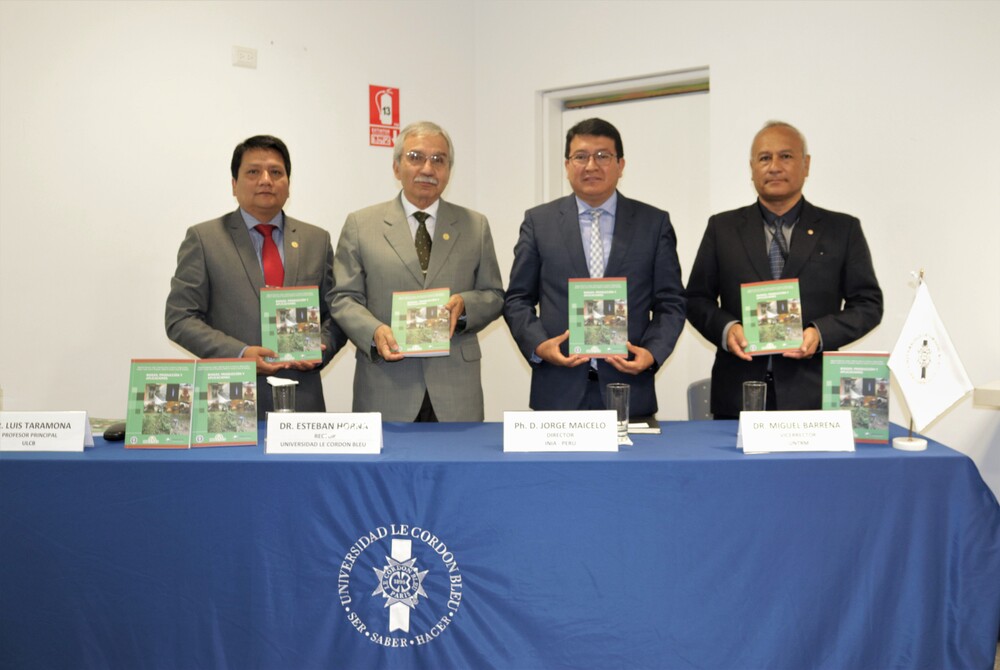 La presentación del libro se realizó en el auditorio de la Universidad y contó con la presencia del Dr. Barrena Gurbillón, autor principal del libro, el PhD. Jorge Maicelo Quintana, jefe del Instituto Nacional de Innovación Agraria – INIA y autor del libro, el docente el Dr. Taramona Ruiz y el rector de la Universidad Le Cordon Bleu, el Dr. Esteban Horna.
